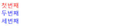 | <!DOCTYPE html> <html> <head> <meta charset="UTF-8"> <title>Insert title here</title> <style type="text/css"> /* id μ νμ */ /* id μμ±κ°μ΄ firstDivμΈ νκ·Έλ₯Ό μ ν */ #firstDiv{ color: red; } /* class μ νμ */ .blueDiv{ color: blue; } </style> </head> <body> <div id="firstDiv">첫λ²μ§Έ</div> <div class="blueDiv">λλ²μ§Έ</div> <div class="blueDiv">μΈλ²μ§Έ</div> </body> </html> |