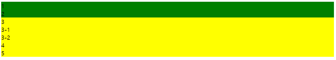 | <!DOCTYPE html> <html> <head> <meta charset="UTF-8"> <title>Insert title here</title> <style type="text/css"> /* μμ μ νμ */ /* idμμ±μ΄ div1μΈ νκ·Έμ μμ div νκ·Έλ₯Ό μ ν */ #div1 > div{ background: green; } /* classκ° div2μΈ νκ·Έμ μμ div νκ·Έλ₯Ό μ ν */ .div2 div{ background: yellow; } </style> </head> <body> <div> <div id="div1"> <div>1</div> <div>2</div> </div> <div class="div2"> <div>3 <div>3-1</div> <div>3-2</div> </div> <div>4</div> <div>5</div> </div> </div> </body> </html> |