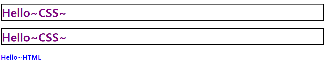 | <!DOCTYPE html> <html> <head> <meta charset="UTF-8"> <title>Insert title here</title> <!-- css λ΄μ©μ style νκ·Έ μμ μμ± --> <style type="text/css"> /* λμμΈμ λ³κ²½νλ €λ©΄ μ°μ μ μΌλ‘ λμμΈμ λ³κ²½ν νκ·Έλ₯Ό μ νν΄μΌ νλ€. */ /* λμμΈμ λ³κ²½ν λλ λ¨Όμ λμμΈμ μ μ©ν νκ·Έλ₯Ό μ νν μ μμ΄μΌ ν¨. */ /* μ΄λ¬ν νκ·Έλ₯Ό μ ννλ λ°©λ²μ μ νμλΌκ³ νλ€. */ h1{ color: purple; /* μμ±: μμ±κ° , 컬λ¬: κΈμμ. */ border: 3px solid black; /* ν λ리 1px(κ΅΅κΈ°) μ€μ (μ μ€νμΌ) κ²μμ */ } h3{ color: blue; } </style> </head> <body> <h1>Hello~CSS~</h1> <h1>Hello~CSS~</h1> <h3>Hello~HTML</h3> </body> </html> |