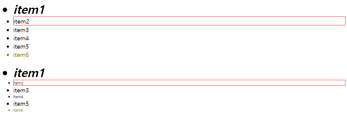 | <!DOCTYPE html> <html> <head> <meta charset="UTF-8"> <title>Insert title here</title> <style type="text/css"> /* νΉμ nλ²μ§Έ μμμ μ§μ νλ μ νμ */ /* ul νκ·Έμ μμ μ€ μ²«λ²μ§Έ liνκ·Έ μ ν */ ul > li:first-child{ font-size: 30px; font-style: italic; font-weight: bold; } ul > li:last-child { color: olive; } ul > li:nth-child(2) { border: 1px solid red; } #secondUL > li:nth-child(even) { font-size: 10px; } </style> </head> <body> <ul> <li>item1</li> <li>item2</li> <li>item3</li> <li>item4</li> <li>item5</li> <li>item6</li> </ul> <ul id="secondUL"> <li>item1</li> <li>item2</li> <li>item3</li> <li>item4</li> <li>item5</li> <li>item6</li> </ul> </body> </html> |