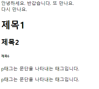 <h1>์ ๋ชฉ1</h1> <!--h1~6 ํ๊ทธ๋ ์ ๋ชฉ ์์ฑ ํ๊ทธ, ์ค ๋ฐ๊ฟ ๋ด์ฉ๋ ์๋ ํฌํจ -->