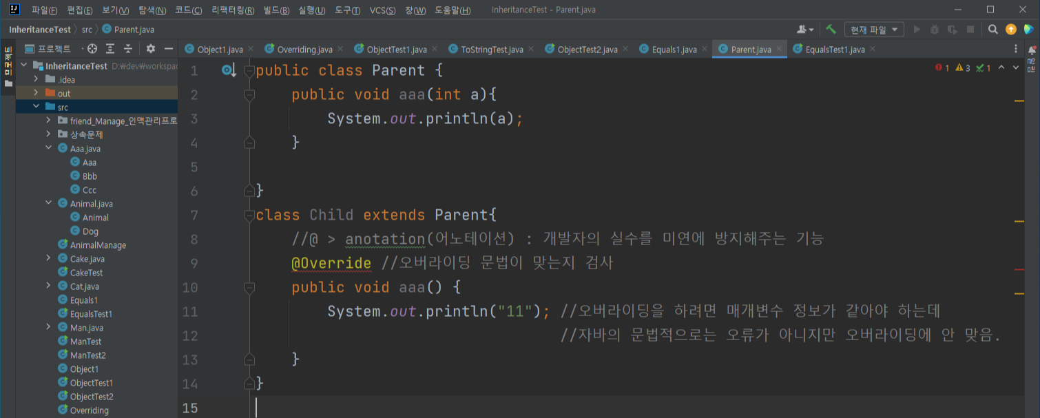 @Override //์ค๋ฒ๋ผ์ด๋ฉ ๋ฌธ๋ฒ์ด ๋ง๋์ง ๊ฒ์ฌ